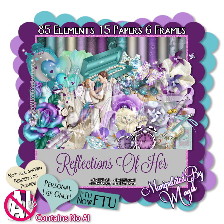 βReflections Of Herβ is a beautiful, romantic, pastel kit filled with 85 elements, 15 papers, and 6 frames. The papers are 900 X 900 px. Since this is an older kit, there is no AI-generated items in it.